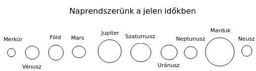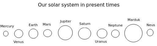Az ábráról kitűnik, hogy a mai modern csillagászat még nem fedezett fel két égitestet a Plútón kívül, vagy ha igen, akkor eltitkolja azt. A két külső bolygó, a Marduk (Nibiru), és a Neusz nagy, ellipszis alakú pályán kering a Nap körül. A Marson és a Prosperinen laktak ezek a lírai menekültek ebben a Naprendszerben. Fizikailag ember formájúak voltak, olyanok, mint mi, csak magasságuk, és a súlyuk tért el a mai emberétől. Ők sokkal magasabbak voltak, átlagos magasságuk a 9 métert is elérte.