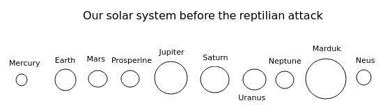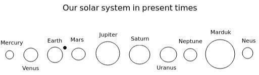 Az ábráról kitűnik, hogy a mai modern csillagászat még nem fedezett fel két égitestet a Plútón kívül, vagy ha igen, akkor eltitkolja azt. A két külső bolygó, a Marduk (Nibiru), és a Neusz nagy, ellipszis alakú pályán kering a Nap körül. A Marson és a Prosperinen laktak ezek a lírai menekültek ebben a Naprendszerben. Fizikailag ember formájúak voltak, olyanok, mint mi, csak magasságuk, és a súlyuk tért el a mai emberétől. Ők sokkal magasabbak voltak, átlagos magasságuk a 9 métert is elérte.